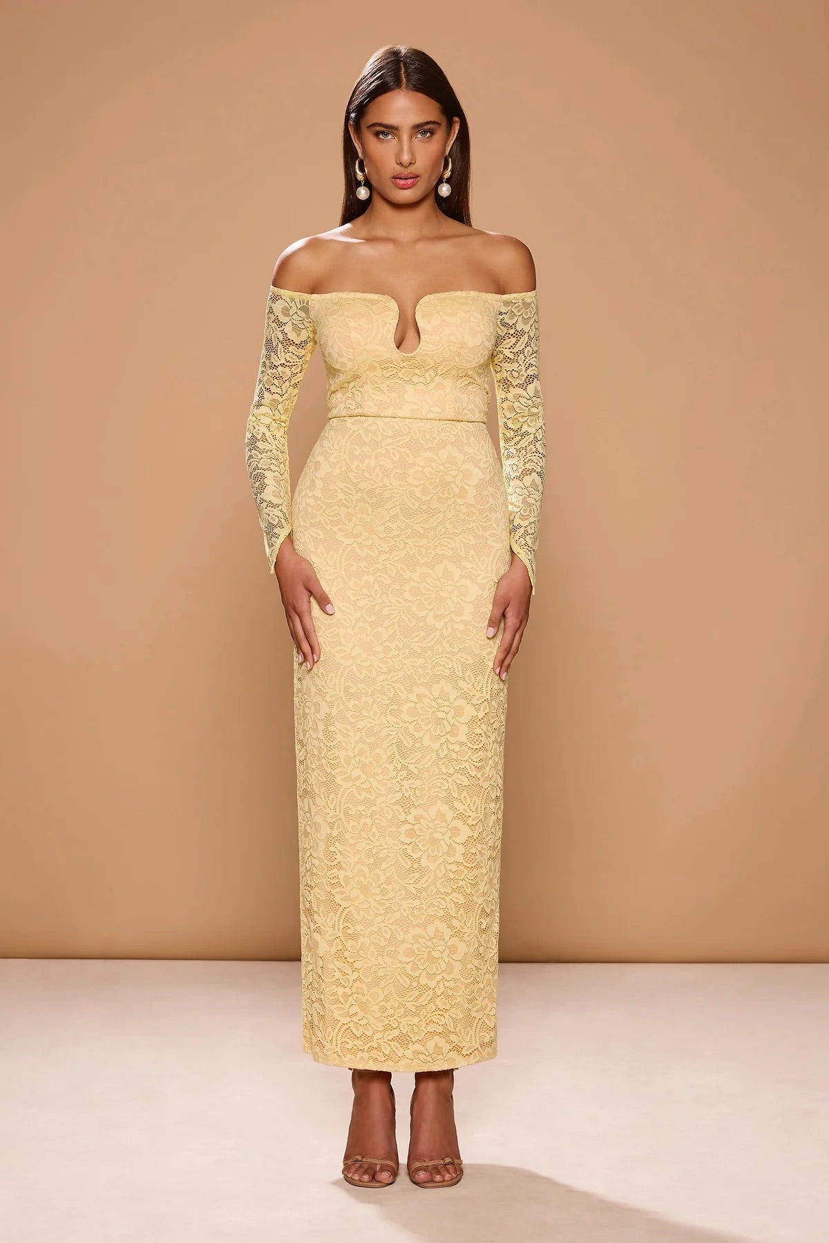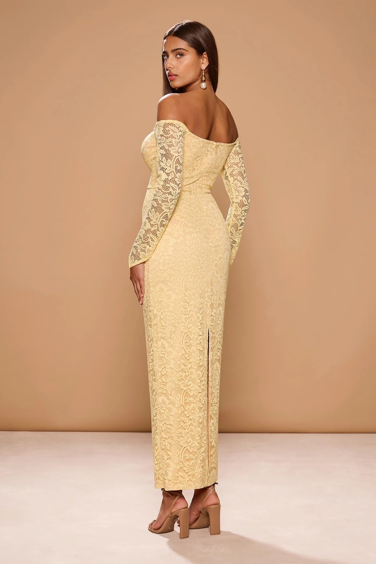 An off-the-shoulder lace dress with angled long sleeves and a keyhole detail.